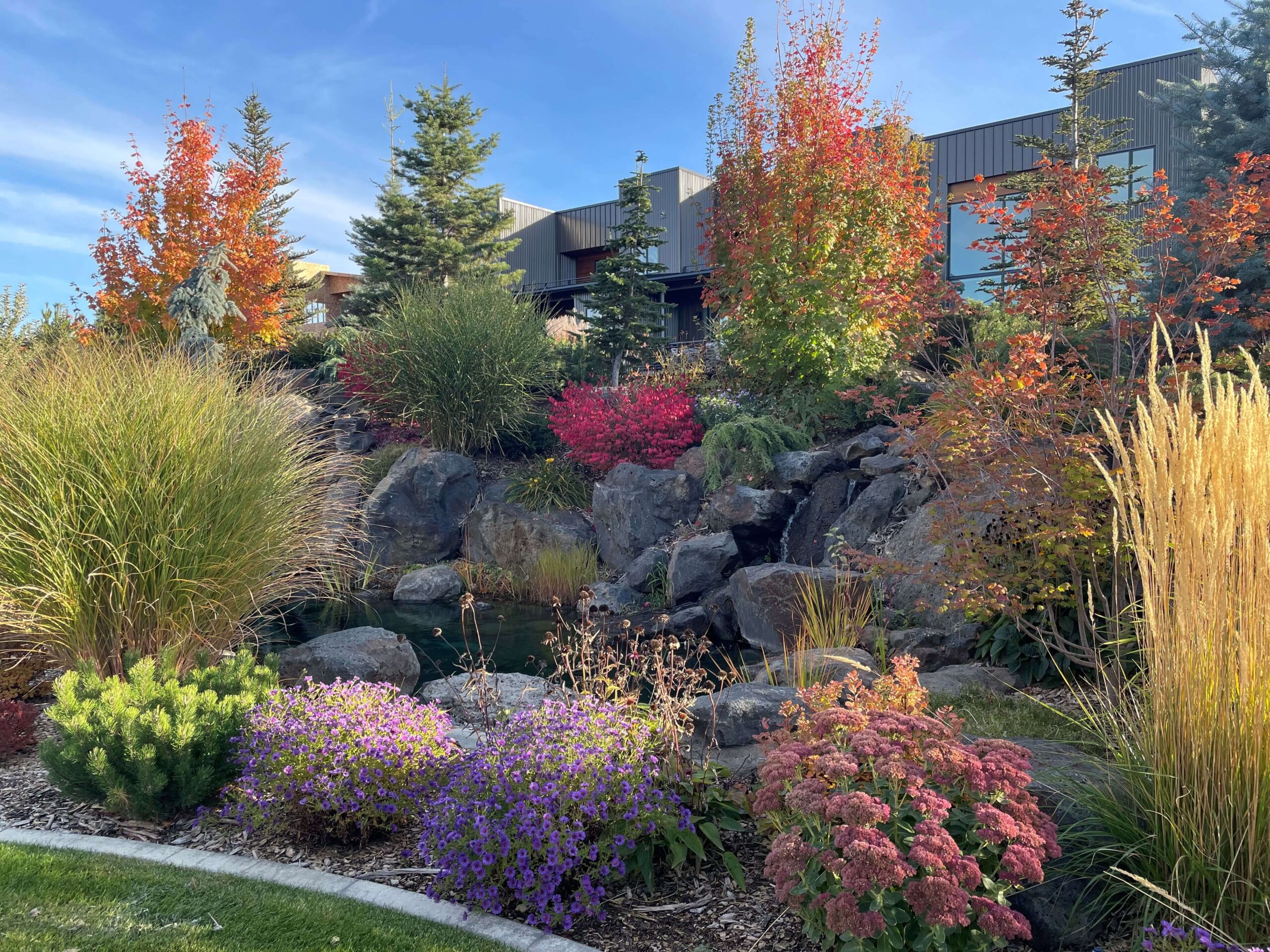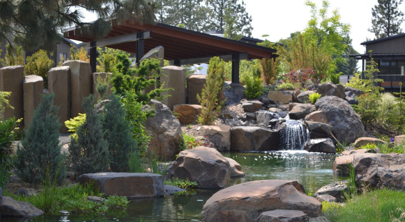 The sights and sound of falling water provide a feeling of serenity and peace –a short and lovely walk for Hidden Gardens’ residents. Landscape lighting provides a magical evening setting.